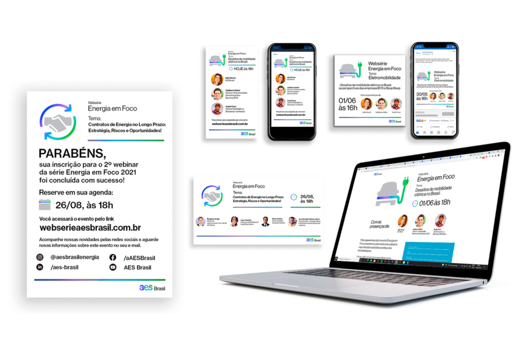 O trabalho envolveu criação de identidade visual específica para cada edição, desenvolvimento de sites completos com múltiplas funcionalidades, materiais de comunicação interna e elementos gráficos de suporte. Os sites funcionavam como plataforma central: área de divulgação dos palestrantes e temas, sistema de inscrições, player para transmissão ao vivo e arquivo das edições anteriores. A direção de arte foi desenvolvida para dar protagonismo aos convidados e conteúdos mantendo alinhamento com a identidade AES. Criamos sistema modular que permitiu replicar estrutura com agilidade a cada novo ciclo.