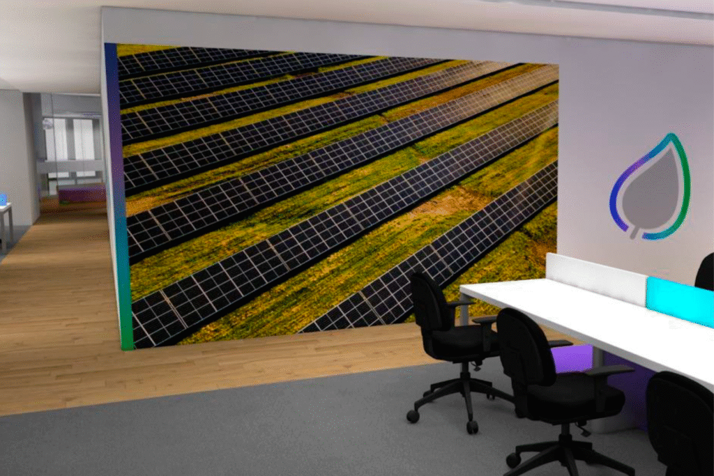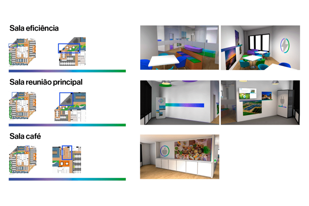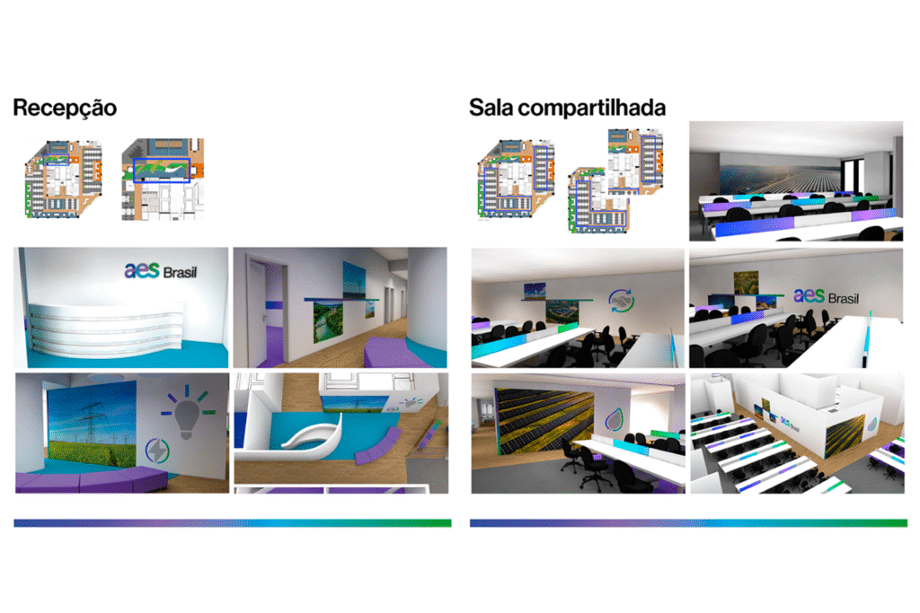 Para renovação do escritório de São Paulo, a AES Brasil precisava de comunicação visual alinhada à identidade corporativa. Desenvolvi proposta completa de ambientação respeitando guia de marca existente. O desafio era traduzir elementos gráficos concebidos para mídia digital em aplicações espaciais e tridimensionais.